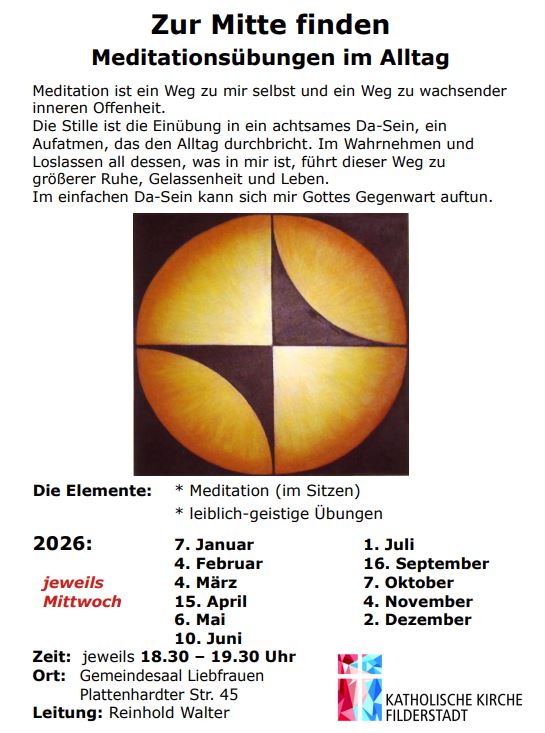 Dezember 11, 2025Veranstaltungen/Feste (Werbung, Berichte, Helferaufruf) 07.01. – Meditation im Alltag Tags: essen, Fastenzeit, Meditation